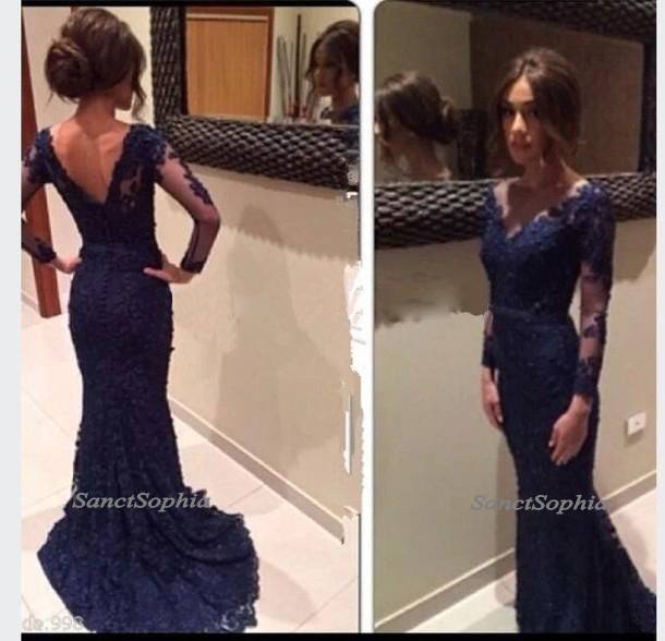 Long Sleeves Navy Blue Lace Prom Dresses, V-neckline Evening Dresses,Mermaid Navy Blue Lace Graduation Dresses