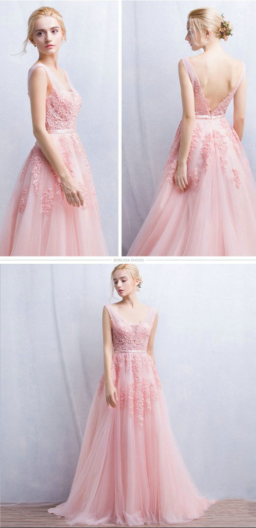 A Line Pink Prom Dress,V-neckline Lace Evening Dress,Sexy Tulle Graduation Dress