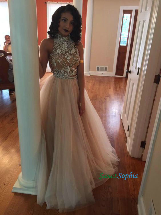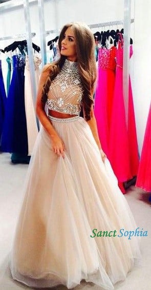 Two Pieces Beaded Prom Dress,Handmade Beaded Tulle Graduation Dress
