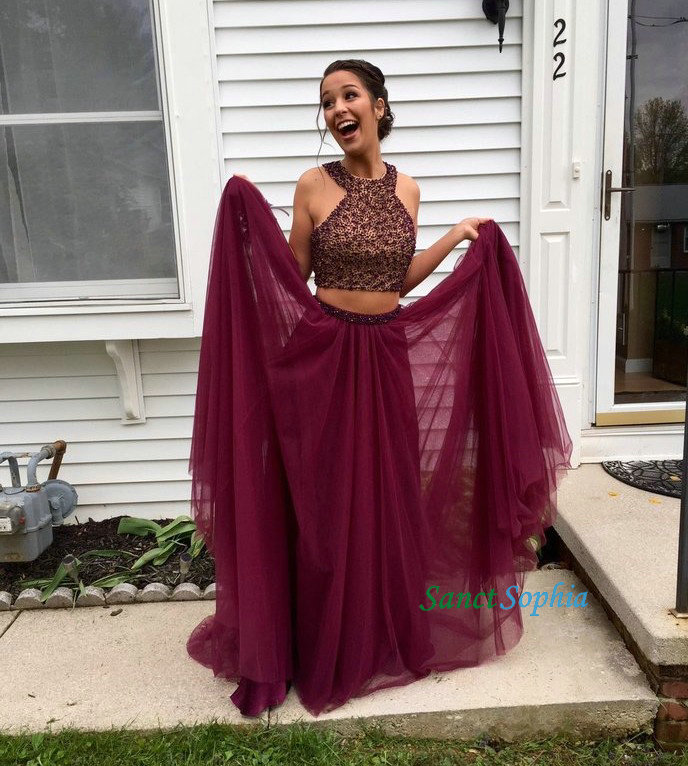 Long Two pieces Burgundy Tulle Prom Dress,Beading 2 pieces Graduation Dress