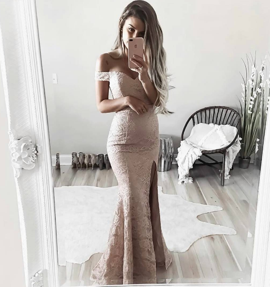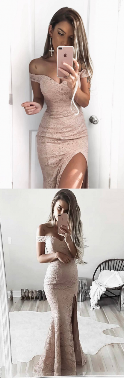 Mermaid Lace Evening Dress,Sexy Slit Prom Dress, Off Shoulder Sleeves Lace Graduation Dress
