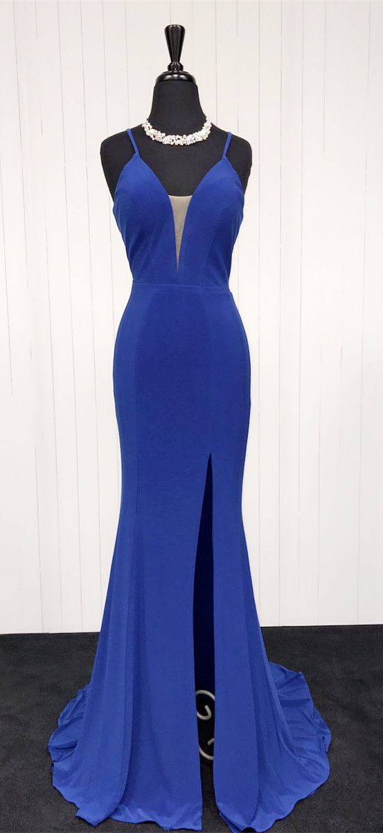 A line Slit Prom Dress,Blue Slit Graduation Dress,Sexy Spaghetti Straps Blue Evening Dress