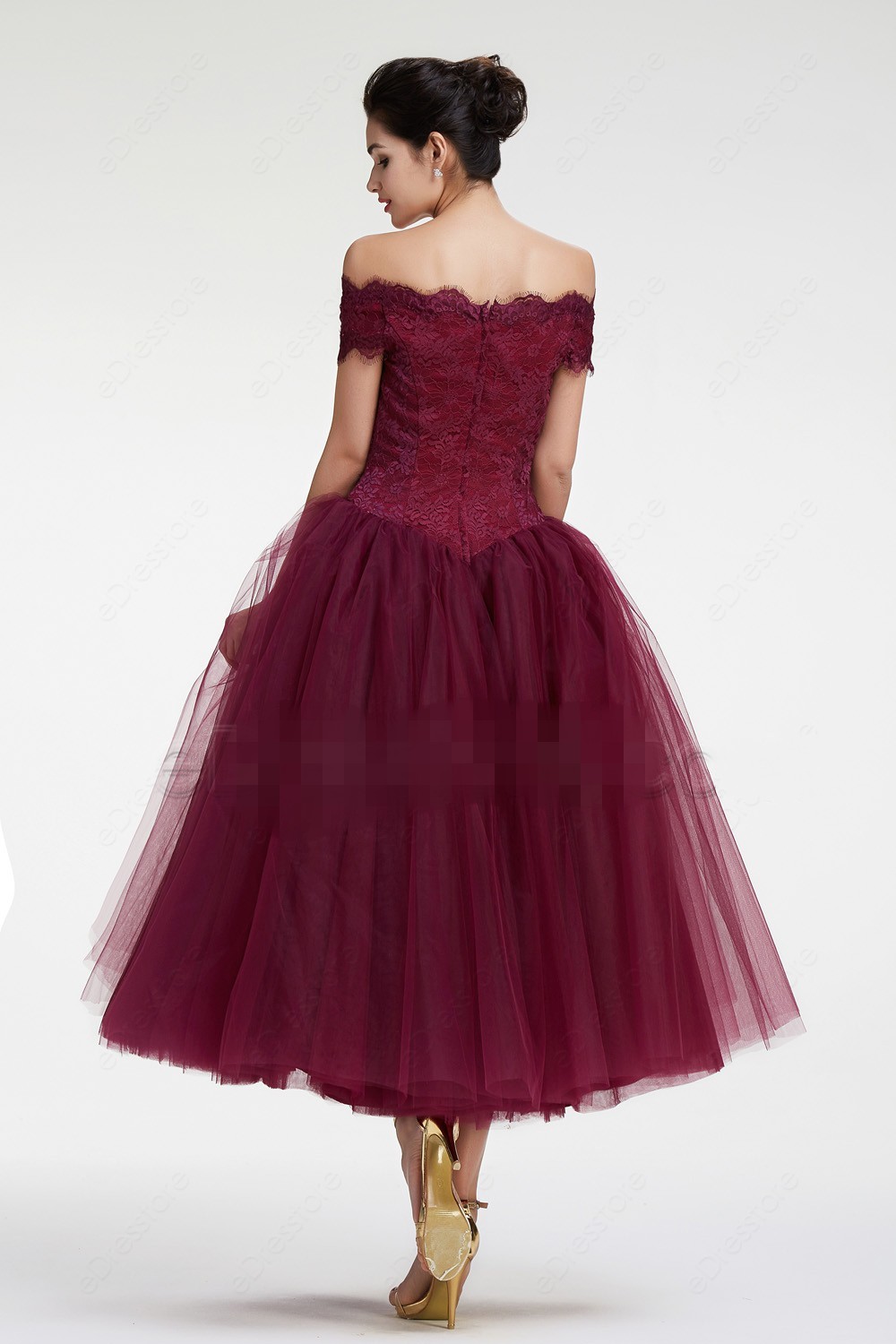 Tea Length Ball Gown Off Shoulder Sleeves Burgundy Tulle Prom Dress,Burgundy Homecoming Dress,Tea Length Sexy Burgundy Lace Graduation Dress