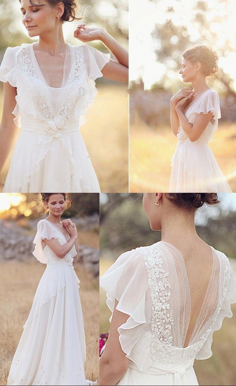 Simple Informal V-neck Chiffon Summer Outdoor Wedding Dress