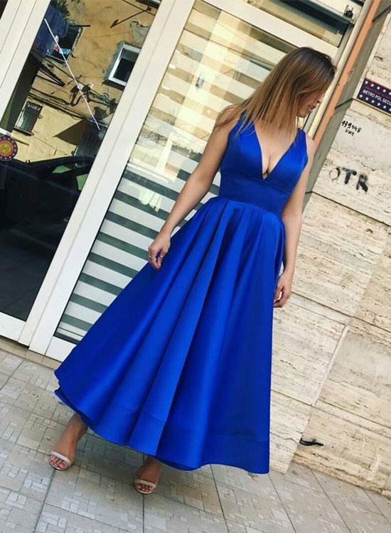 Tea Length Royal Blue Prom Dress,V-neckline Royal Blue Party Dress
