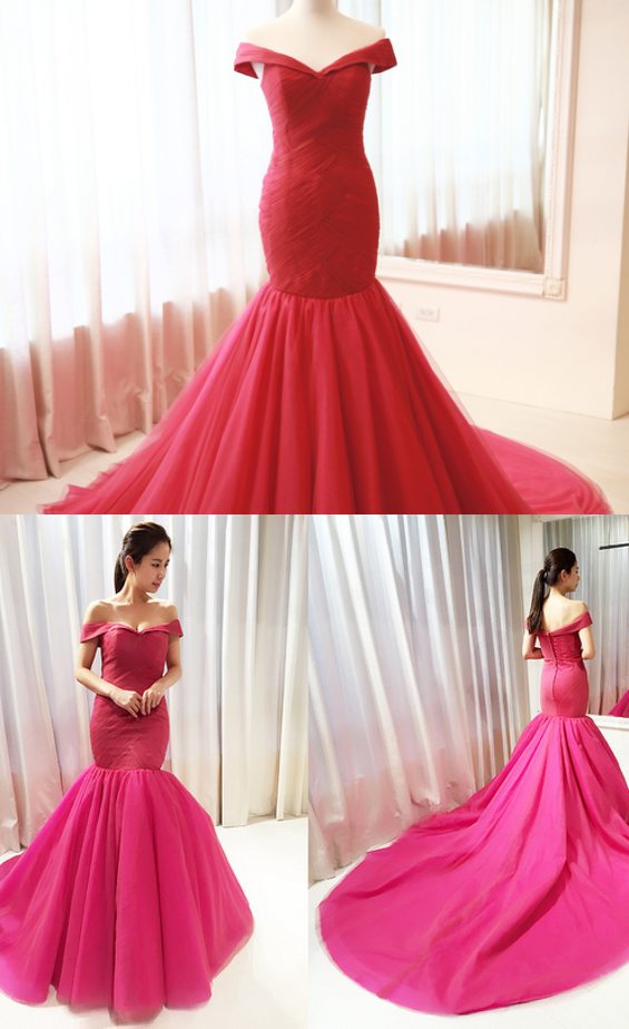 Off Shoulder Sleeves Evening Dress,Red Prom Dress,Sexy Mermaid Red Wedding Dress