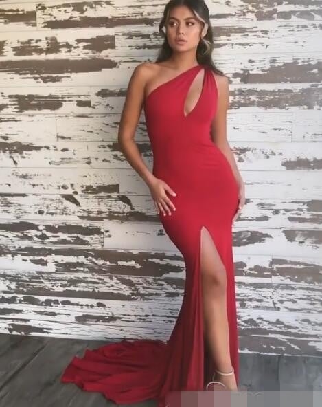 Sexy Slit Evening Dress,Slim Long Prom Dress,One Shoulder Party Dress