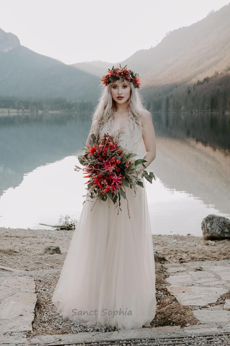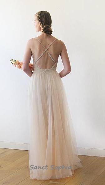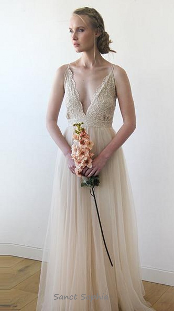 Sexy Spaghetti Straps Champagne Bohemian Wedding Dress