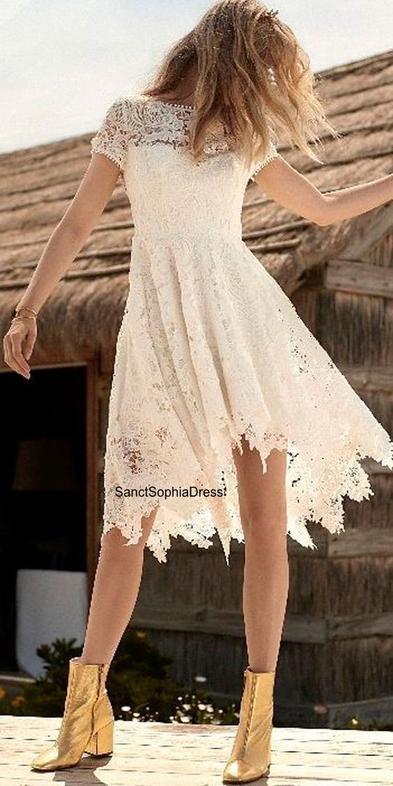 Short Boho Wedding Dress,High Quality French Lace Short Sleeve Wedding Dress