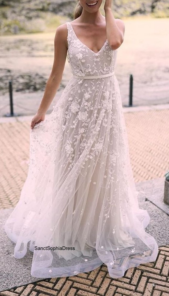 Simple V-neckline Wedding Dress,High Quality French Lace Wedding Dress