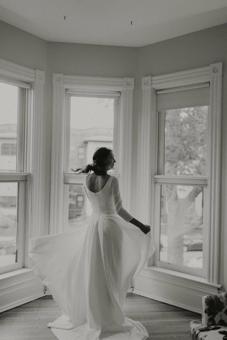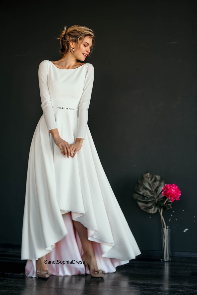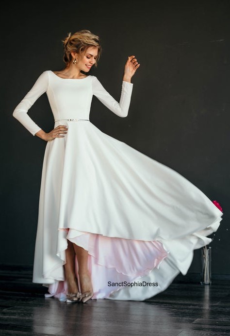 Modest Long Sleeve Wedding Dress,High low Blush Wedding Dress