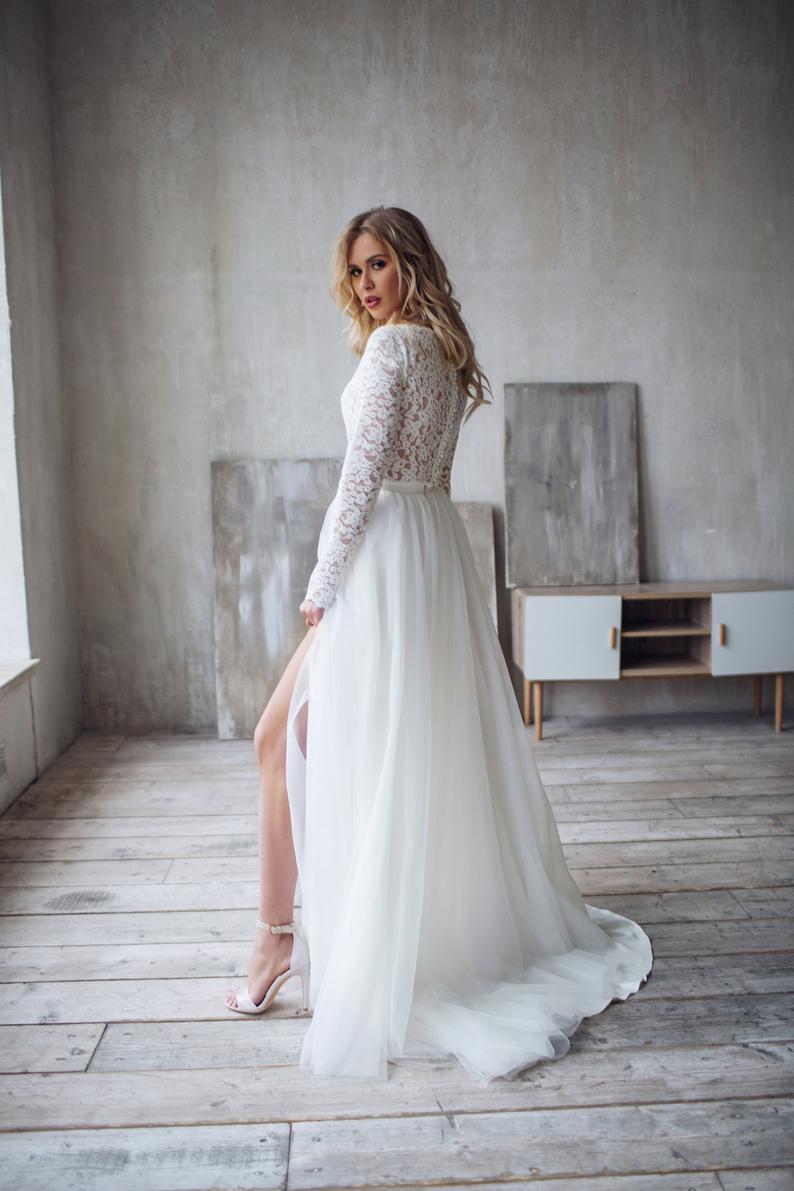 Long Sleeve Lace Wedding Dress,Slit Wedding Dress
