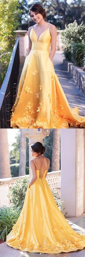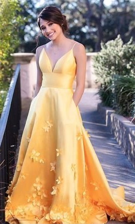 Spaghetti Straps Yellow Prom Dress with Pocket