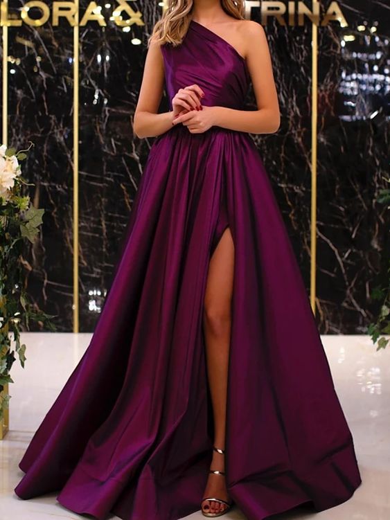 One Shoulder Evening Dress,Grape Prom Dress,Sexy Slit Pageant Dress