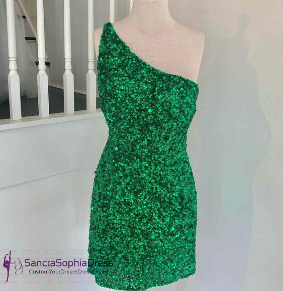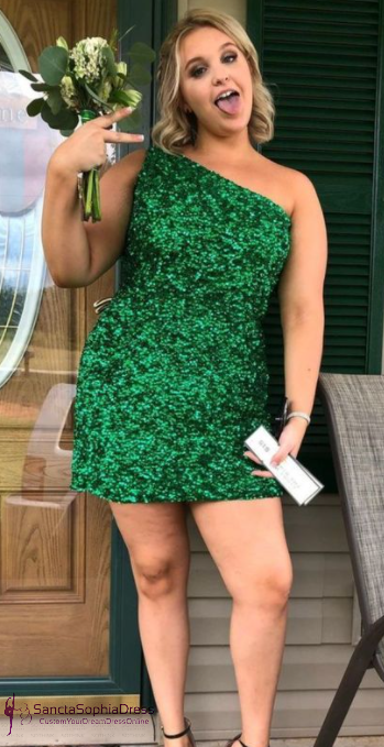 Short One Shoulder Green Sequins Homecoming Dress