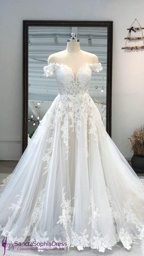 Off Shoulder Sleeve Sheer Lace Wedding Dress